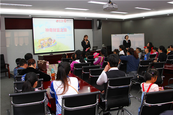 潍坊银行工作人员为参与家庭普及少儿理财知识(唐锋/摄影)