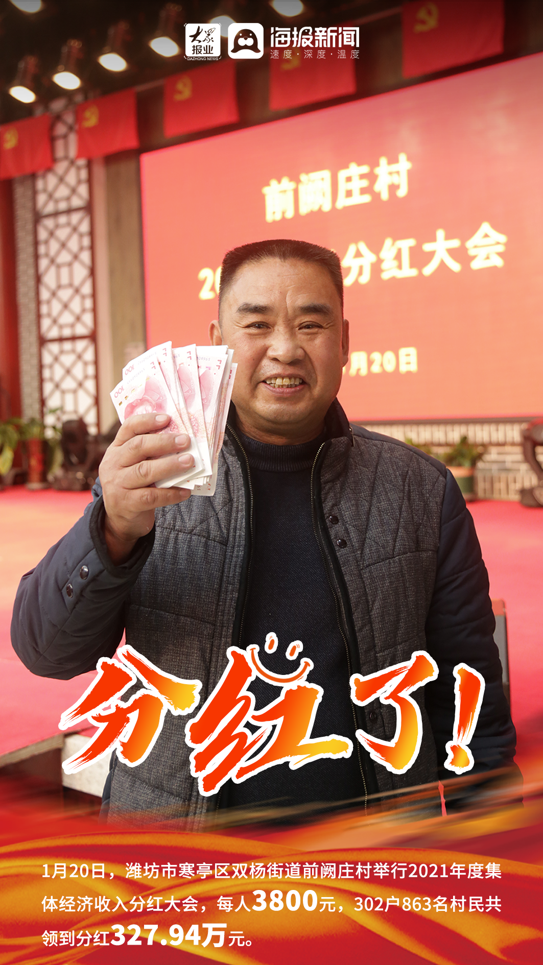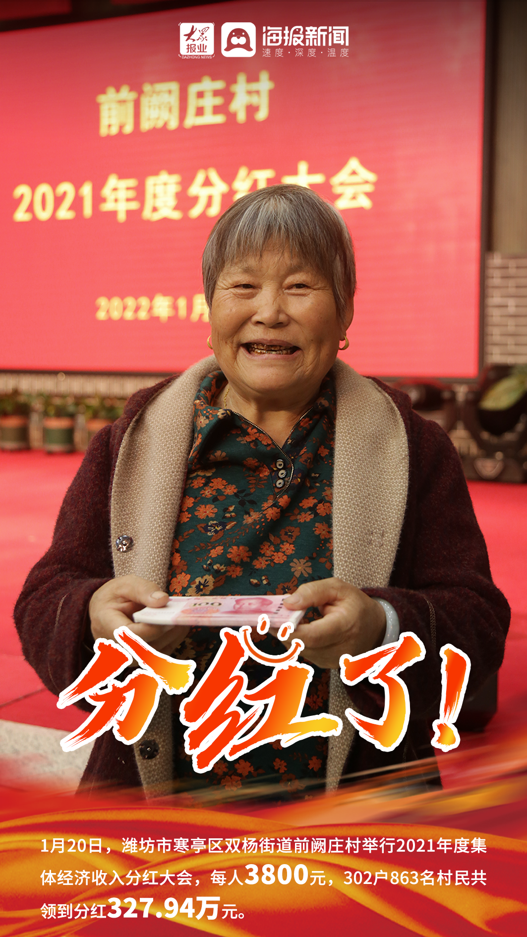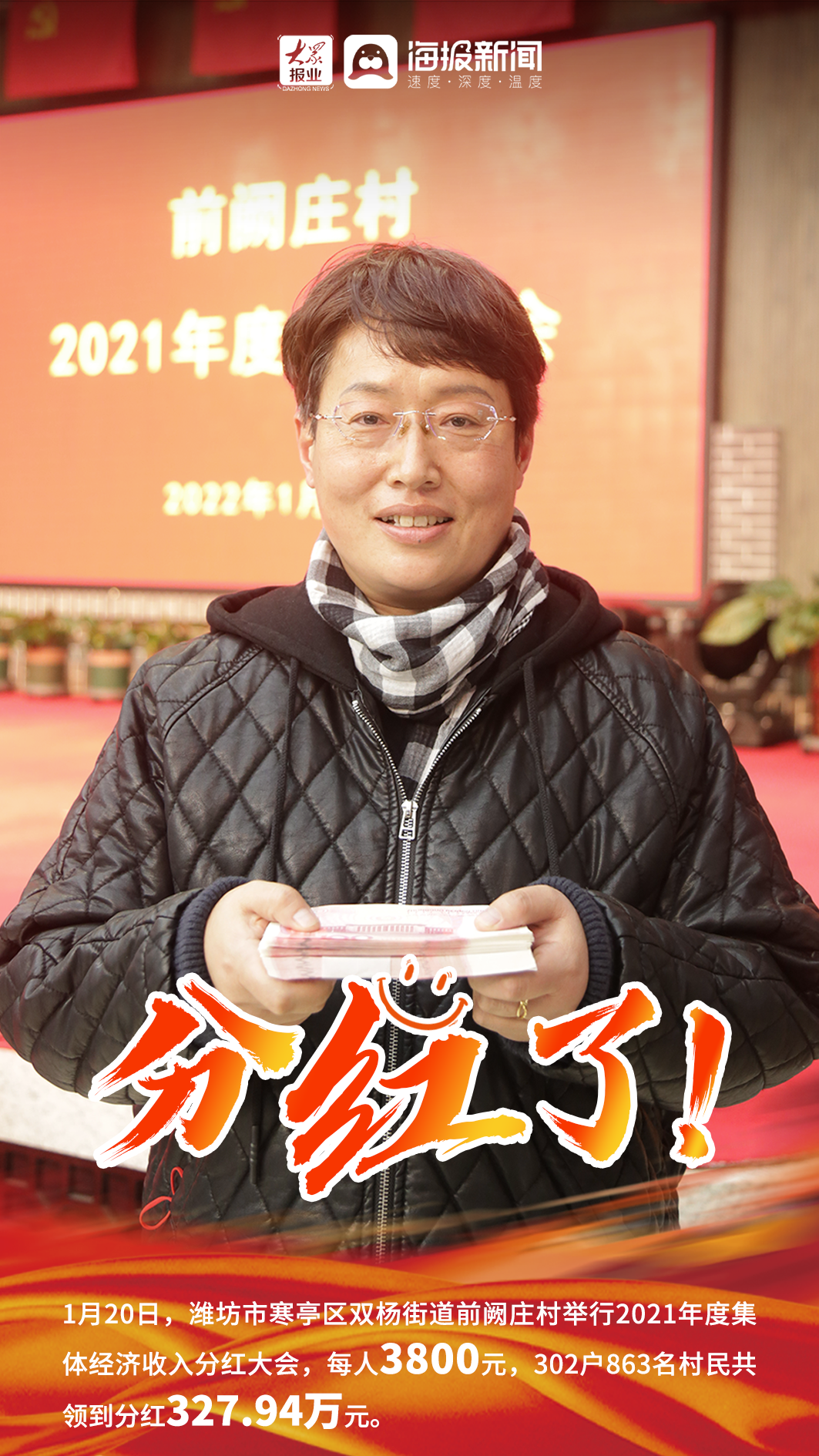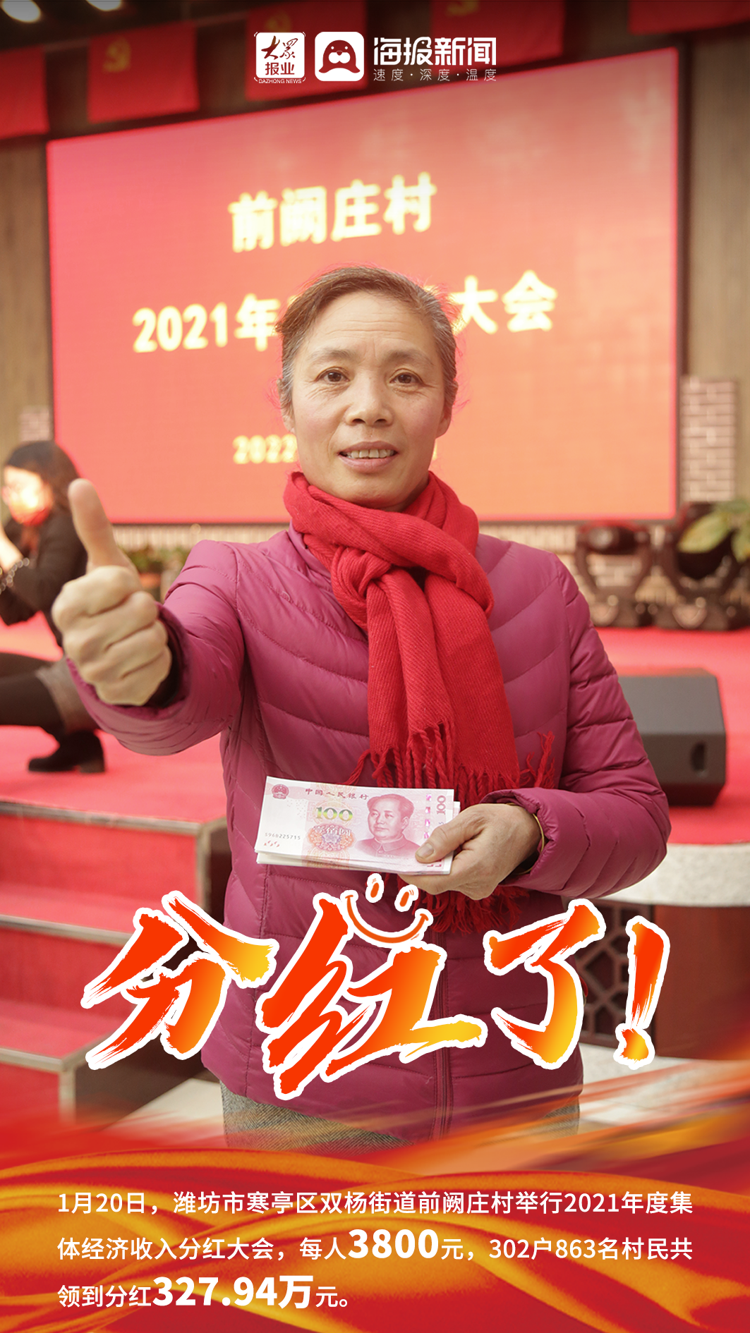 分红了!1月20日,潍坊市寒亭区双杨街道前阙庄村举行2021年度集体经济收入分红大会,每人3800元,302户863名村民共领到分红327.94万元。
