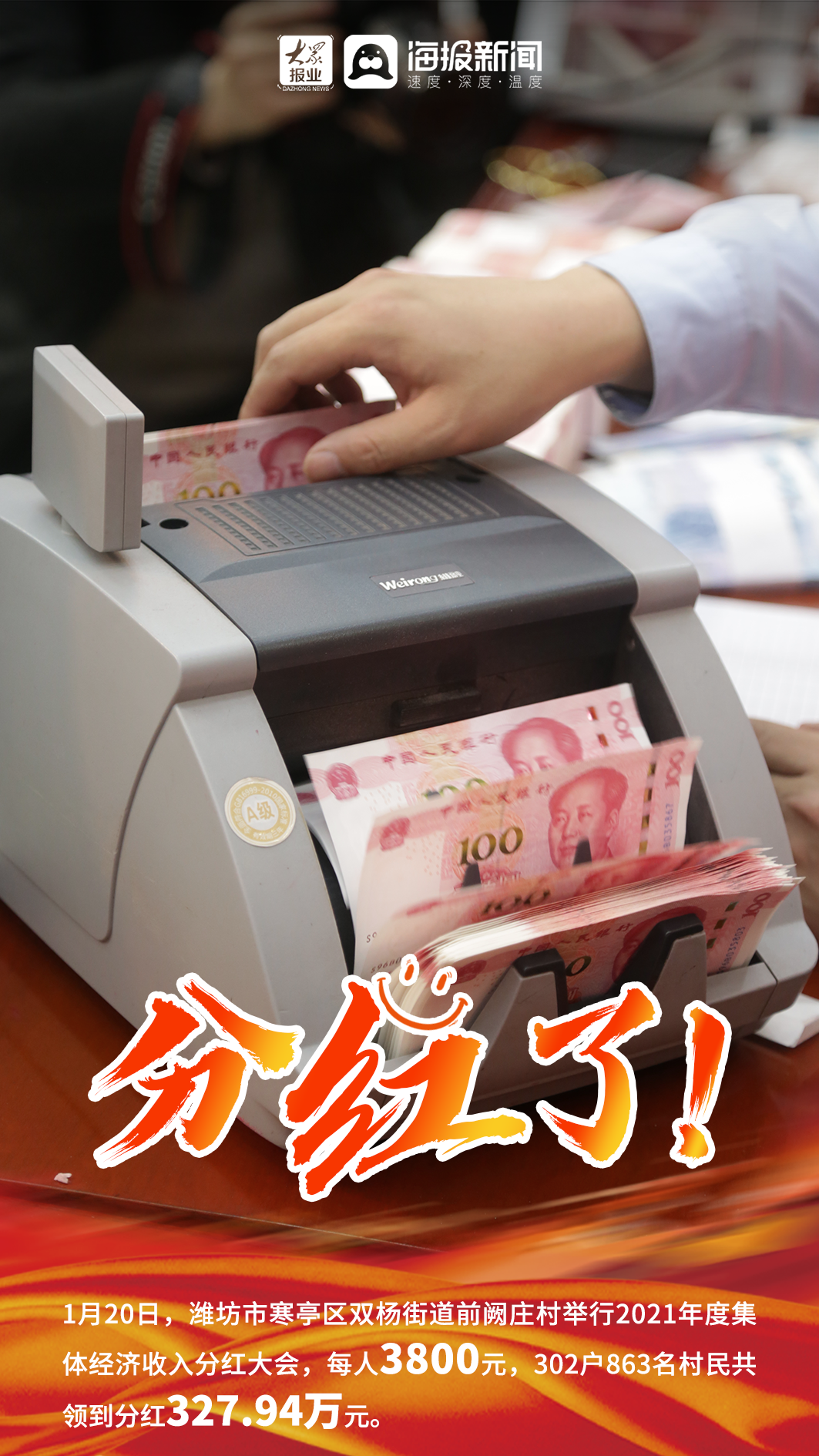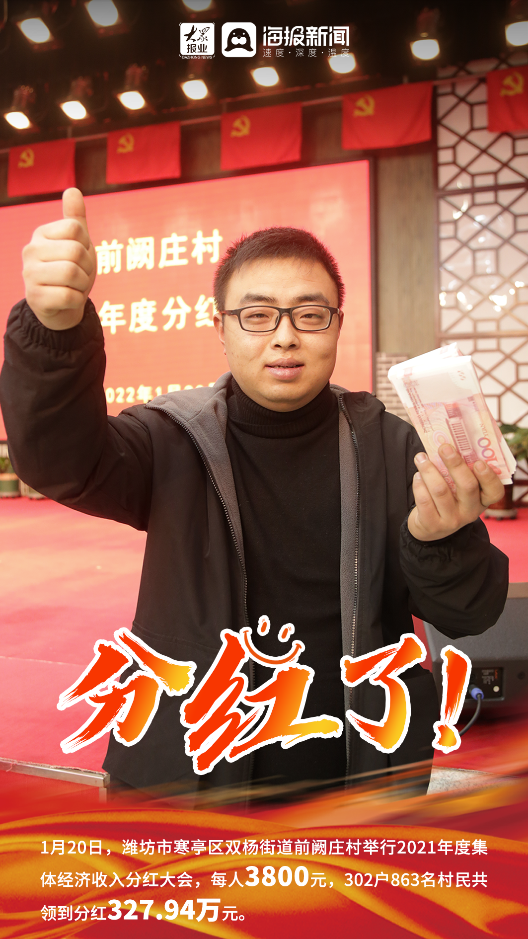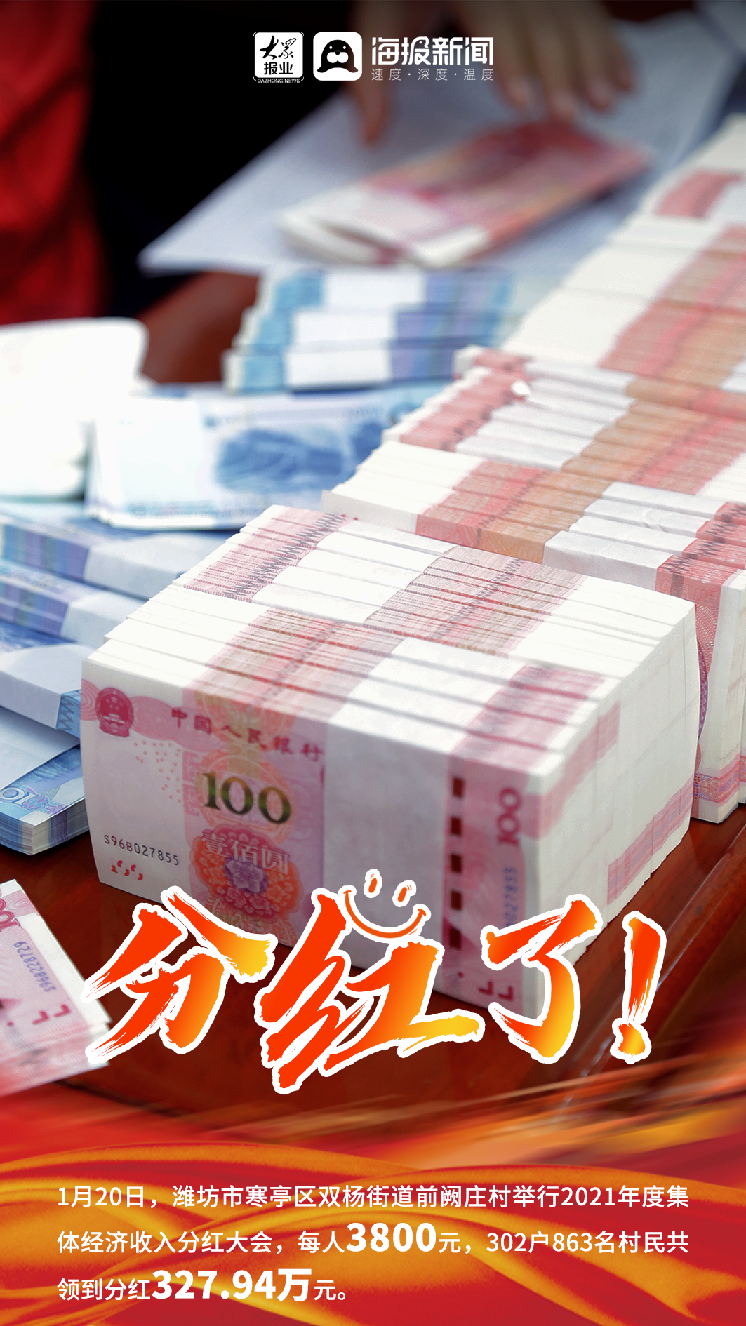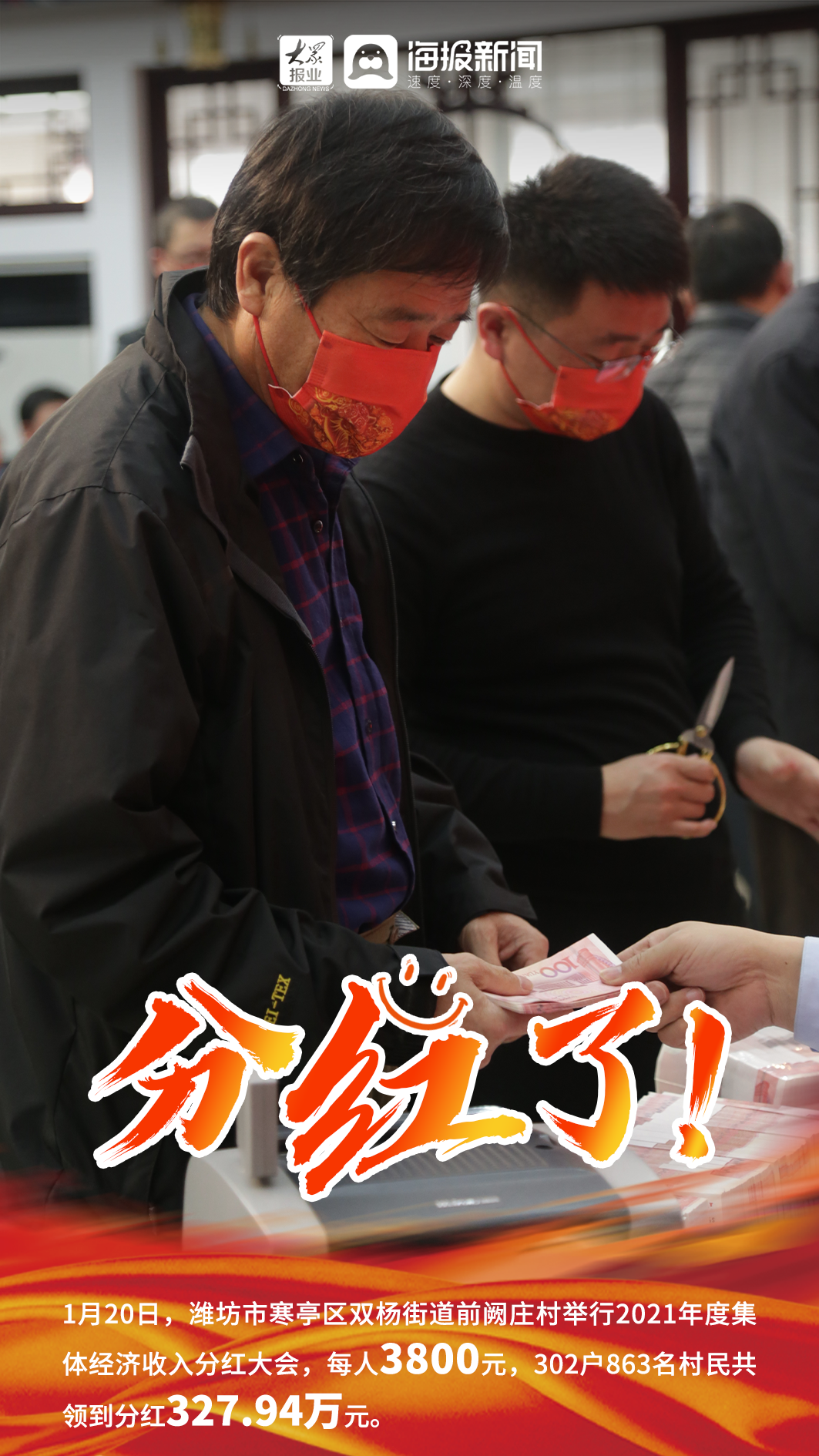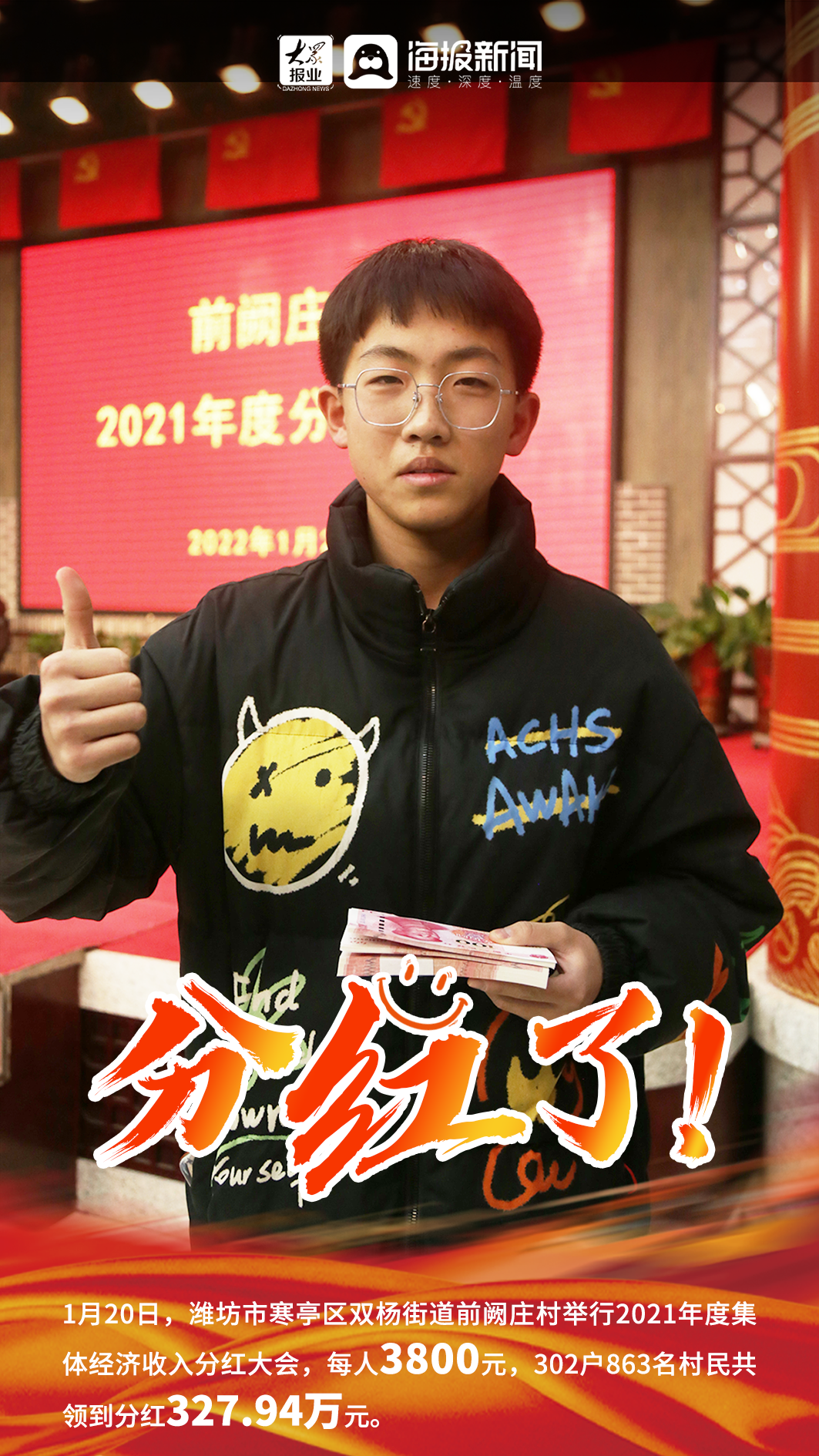 分红了!1月20日,潍坊市寒亭区双杨街道前阙庄村举行2021年度集体经济收入分红大会,每人3800元,302户863名村民共领到分红327.94万元。