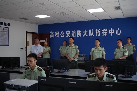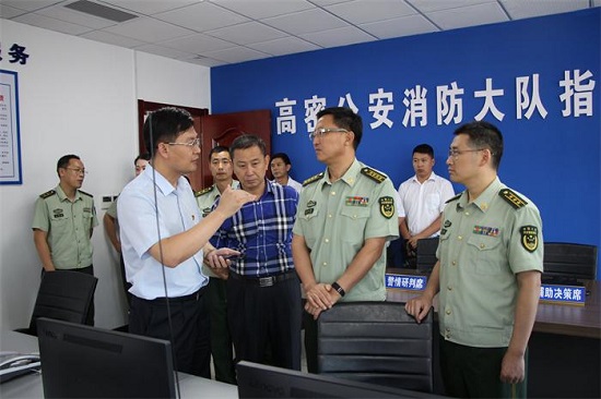 姜自清总工程师一行首先听取了高密消防大队队伍建设和基层基础工作情况介绍,观看了高密市消防工作专题片。在大队119指挥中心详细听取了高密市“智慧消防”云平台试点建设工作专题汇报,对政府督导、部门监管、单位履责和指挥调度四大版块中的社会化消防管理、建筑消防设施检测、消防维保监督、智慧用电云检测、智慧用水云检测、重点部位可视化监管、灭火救援指挥等模块的功能演示,期间,冯效栋副市长还对各模块系统的研发背景、功能应用、当前的工作进度和下一步建设方向进行了详细解说和交流,并亲自演示了社区警务助理APP的操作使用,立志打造新时代的智慧消防。