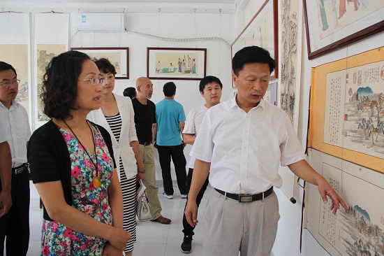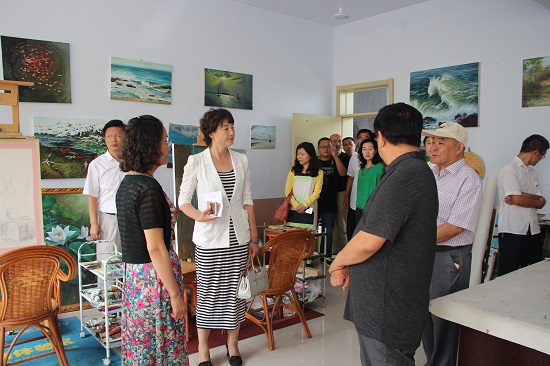 首先,参观团一行人来到高密市美术家协会,分别参观了高密市美协会员展览室、国画创作室、油画创作室。在美协会员展览室,市文联主席张家骥介绍会员轮展情况。国画创作室内,市文联副主席、美协主席宋利华介绍协会近年来的美术创作情况。
