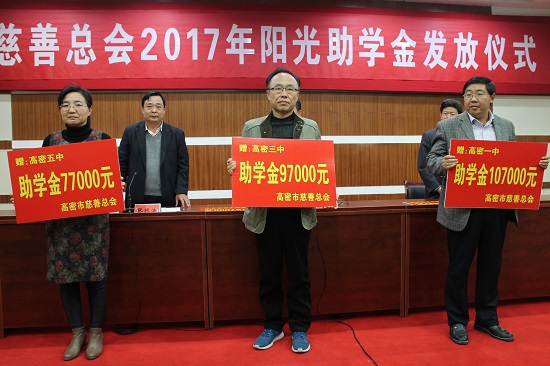 大众网11月7日讯(记者 单越 通讯员 张振荣)11月7日,高密市慈善总会在高密市会议中心一楼会议大厅举行2017年阳光助学金发放仪式。高密市慈善总会副会长秦中廷,高密市教育局局长杜启强,高密市慈善总会秘书长、办公室主任张振法出席发放仪式。这是高密市慈善总会继今年8月份贫困大学生救助活动之后,开展的又一次阳光助学活动,积极帮助全市家庭困难的高中学生完成学业,圆梦大学。