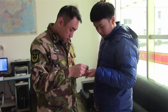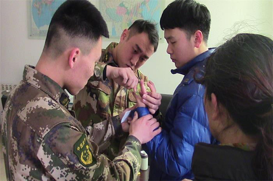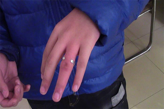 大众网11月24日讯(记者 单越 通讯员 李建)11月19日上午,一位妈妈带着儿子来到潍坊高密大队朝阳中队求助,询问得知,该男孩将一枚戒指戴在手上后无法取下。经中队官兵观察,此戒指为钢制,而且两边都有锋利的花纹,没有接缝,恰巧紧紧卡于男孩手指根部,手指已经血液不流通,有些肿胀,如不及时采取有效措施,后果将不堪设想。