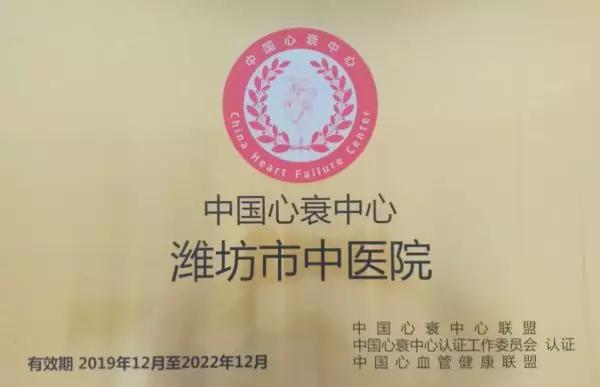 2018年9月1日医院召开潍坊市中医院心衰中心成立启动大会,并设立潍坊市中医院心衰中心专家委员会,医院党委委员、副院长嵇克刚担任心衰中心主任,具体指导和协调各相关专业科室工作;心血管病科唐可清主任担任心衰中心管理办公室主任,积极严谨开展各项建设工作,我院于2018年12月28日顺利成为中国心衰中心建设单位。