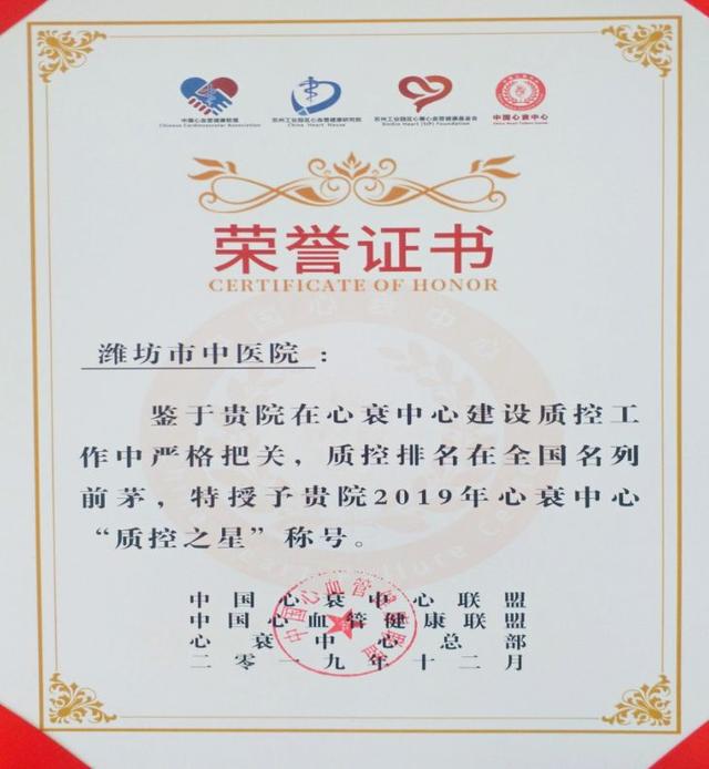 大众网潍坊·海报新闻(记者 沈晓茜 通讯员 谭洁)2019年12月26日-12月28日,中国心血管健康大会(CCHC)2019在苏州国际博览中心隆重召开,其中,中国心衰中心授牌表彰会议上,潍坊市中医院通过中国心衰中心认证,正式成为潍坊市首家标准版中国心衰中心单位。同时,医院被评为2019年度中国心衰中心“质控之星”。