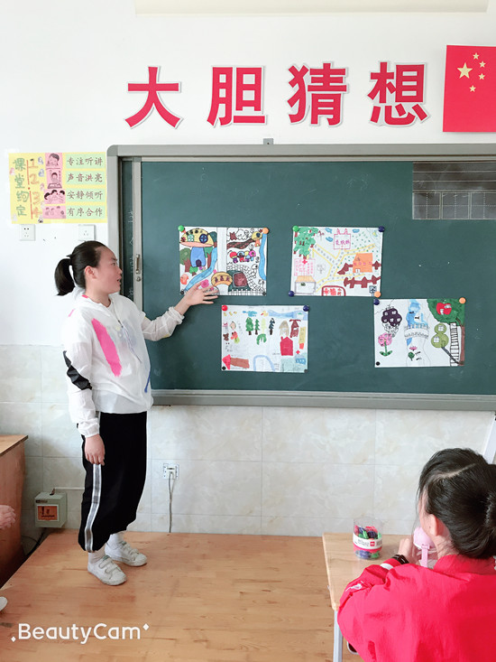 课程伊始,师生首先进行课堂热身,大家在教室中自由行走,展开想象,用肢体语言表演一种动物、一种植物。然后张老师为大家带来了《三只小猪》的童话故事,张老师带领学生进行了情境模拟,当老师讲到哪个事物或情节时,学生便相机表演,孩子们很快就进入了角色,表演也十分入情入境。随后,老师又调动学生的发散思维,让学生以小组为单位展开想象,为三只小猪设计它们的村庄,并向大家进行展示介绍,此时的孩子们思维非常活跃,村庄里的各种设施跃然纸上,可谓丰富多彩、生动有趣,随后,各组代表纷纷向大家介绍展示了自己小组的村庄设计,孩子们情绪高涨、兴趣盎然。