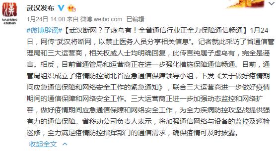1月24日,网传“武汉将断网,以禁止医务人员分享相关信息”。记者就此采访了湖北省通信管理局和三大运营商,相关权威人士均明确回复,此传言纯属子虚乌有,完全是谣言。相反,目前湖北省通管局和运营商正在进一步强化措施保障通信畅通。