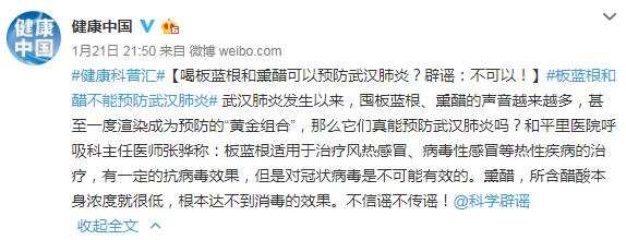 1月21日晚,国家卫健委官方微博@健康中国 对于喝板蓝根、熏醋可以预防新型冠状病毒的说法辟谣。