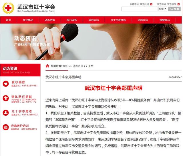 近日,有网络传言“武汉市红十字会向上海医疗队收取6%—8%捐赠服务费”。记者从中国红十字会了解到,武汉市红十字会只负责接收捐赠物资,具体发放分配,由武汉市卫健委统一根据各医院实际需求调拨安排,运送车辆由各医院自行安排,武汉市红十字会的转运车辆也是通过与武汉市交通委员会协调后,免费运送。武汉市红十字会至今为止的所有工作流程中,均不存在任何收费现象。