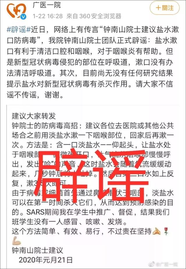 网传“钟南山院士建议盐水漱口防病毒”。广州医科大学附属第一医院钟南山院士团队辟谣:盐水漱口有利于清洁口腔和咽喉,对于咽喉炎有帮助。但是新型冠状病毒侵犯的部位在呼吸道,漱口没有办法清洁呼吸道。其次,目前尚无任何研究结果提示盐水对新型冠状病毒有杀灭作用。