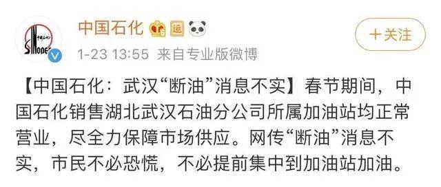 1月23日,中国石化官方微博发布消息称,网传武汉“断油”消息不实,市民不必恐慌,不必提前集中到加油站加油。