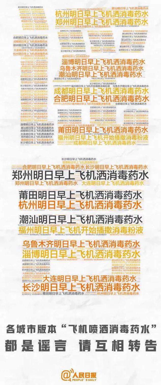 实际上,各城市版本的“飞机喷洒消毒药水”的消息都是谣言,请大家相互转告,不信谣,不传谣!