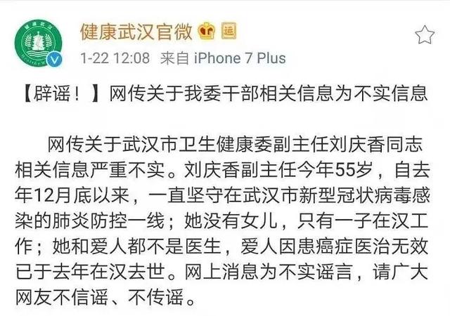 1月22日中午,武汉市卫健委发布辟谣信息: