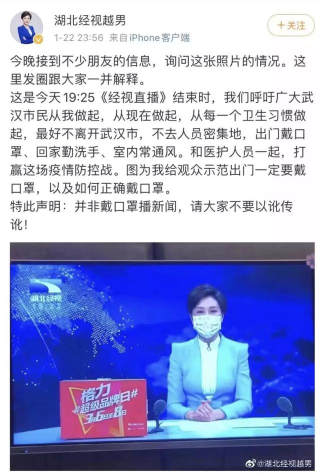 1月22日,有网友发现,湖北经视、湖北公共新闻频道的多位主持人、记者在播报中戴上了口罩。有人感叹“电视史上第一次”,还有人表示此举可以为观众提供更好的公共卫生示范。