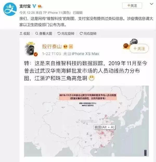 1月22日中午,支付宝官方微博公开辟谣:“这是网传‘维智科技’的制图,支付宝没有提供过类似信息。涉疫情信息请大家以卫生防疫部门公布为准。”