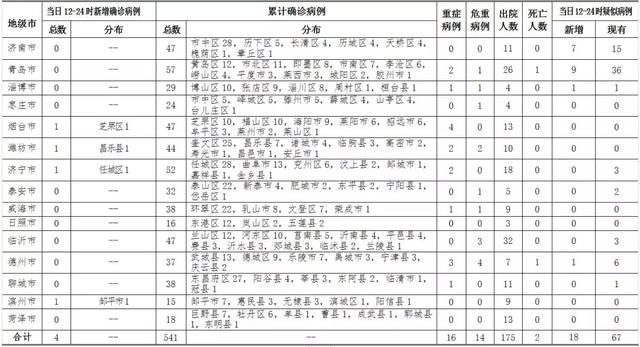 2020年2月16日12-24时,山东省报告新增新型冠状病毒肺炎确诊病例4例,累计确诊病例541例(含重症病例16例,危重症病例14例,治愈出院175例,死亡病例2例);新增疑似病例18例,现有疑似病例67例。截至目前,追踪到密切接触者15756人,已解除医学观察12204人,诊断为疑似或确诊病例289例,尚有3263人正在接受医学观察。