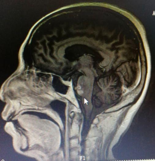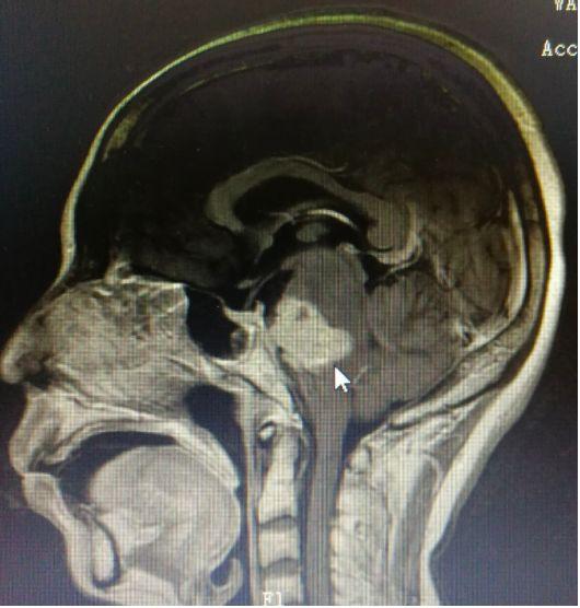 治疗前(1月27日)正中矢状位强化MRI片,鼠标剪头所指白色部分为强化的肿瘤病变。