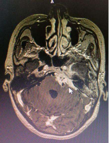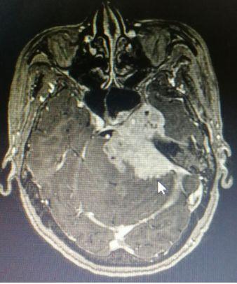 治疗结束后17天(2月25日)轴位与前片相同层面强化MRI片,鼠标箭头所指白色部分为病变,与前片相比病变明显缩小。