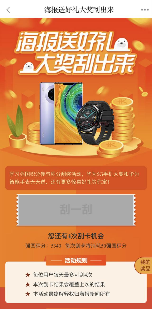 在积分刮奖页面右下角“我的奖品”中,可以查看已获得的奖品内容。抽到实物奖品的用户,请尽快在领奖页面填写个人信息资料,以免奖品无法送达。本次活动奖品丰厚,有华为Mate30 5G手机、华为WATCH GT2 智能手表、现金红包、海报积分等,大礼包天天送不停,各类奖品总价值近200万元。