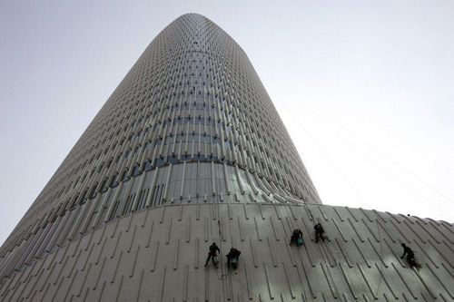 3月14日,上海虹桥附近的LV大厦,工人正在清洁楼体。