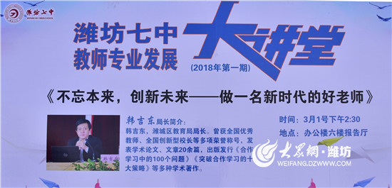 大众网3月2日讯 3月1日下午,潍坊七中教师发展大讲堂成功开课。学校邀请全国优秀教师、潍坊市人民政府督学、潍城区教育局局长韩吉东,莅临我校做了题为《不忘本来,创新未来——做一名新时代的好老师》的专题报告。报告会在学校厚德楼多媒体报告厅举行,全体管理干部和任课教师参加。这也是我校践行教师专业发展、业务成长的重要举措。