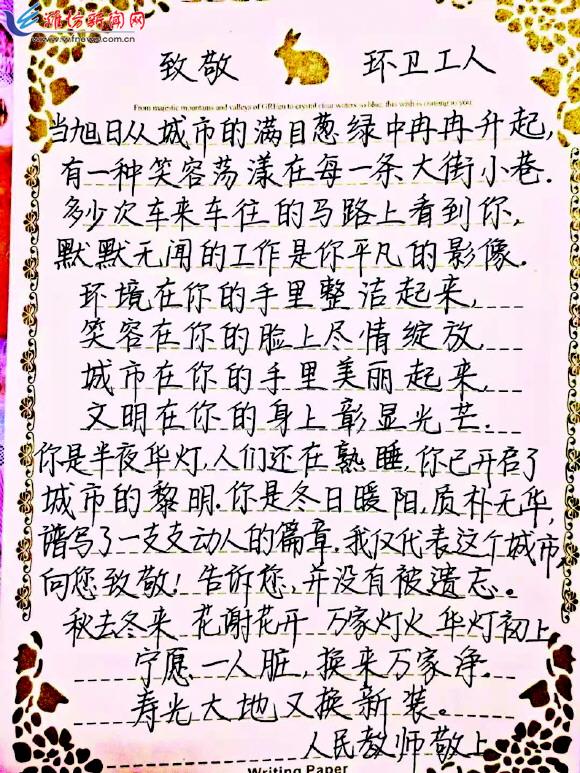 “当旭日从城市的满目葱绿中冉冉升起,有一种笑容荡漾在每一条大街小巷,多少次车来车往的马路上看到你,默默无闻的工作是你平凡的影像……”11月21日,一位年轻女教师来到寿光环卫集团,送去了亲笔信《致敬环卫工人》和一幅画像,并带去四千余只口罩,表达她对环卫工人们的敬意。