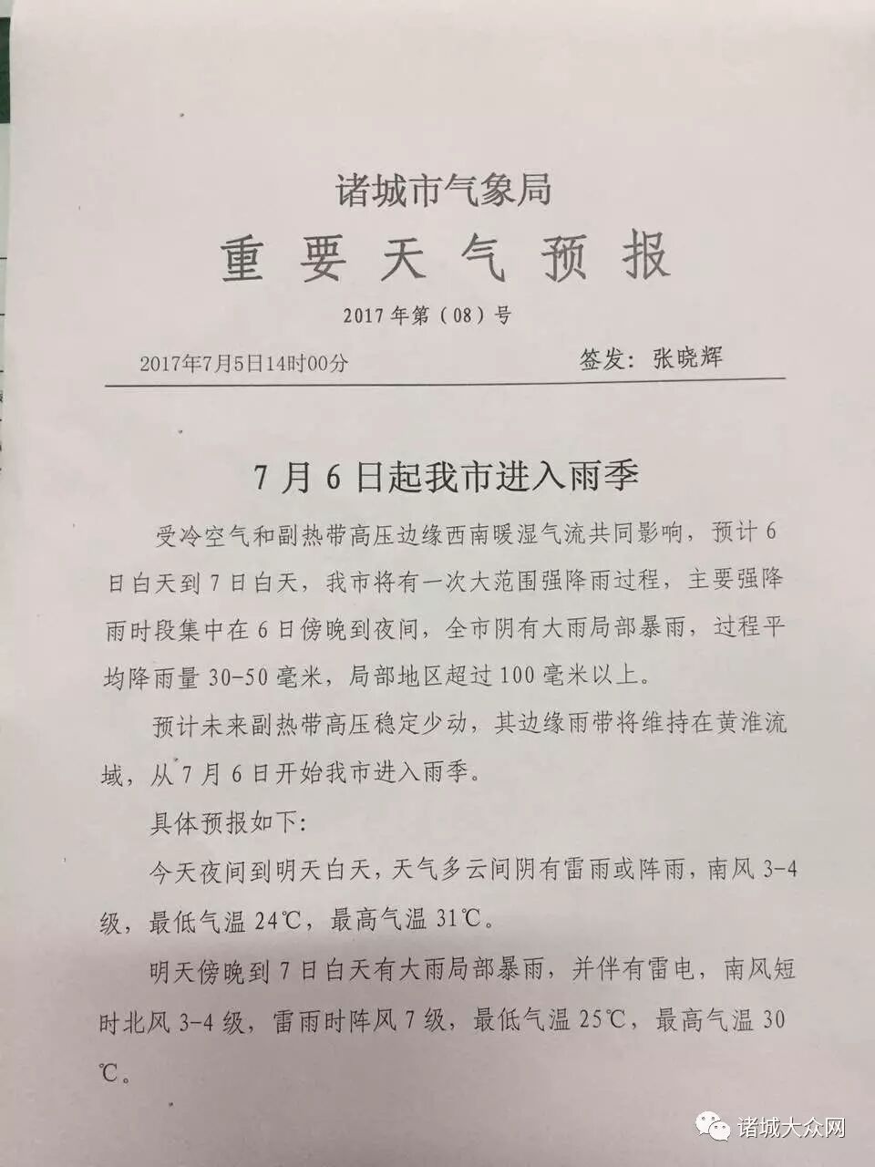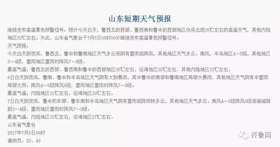 山东省气象台于7月5日06时00分继续发布高温黄色预警信号,预计今天白天,鲁西北的西部、鲁西南和鲁中的西部地区仍将出现35℃左右的高温天气,其他内陆地区32℃左右。