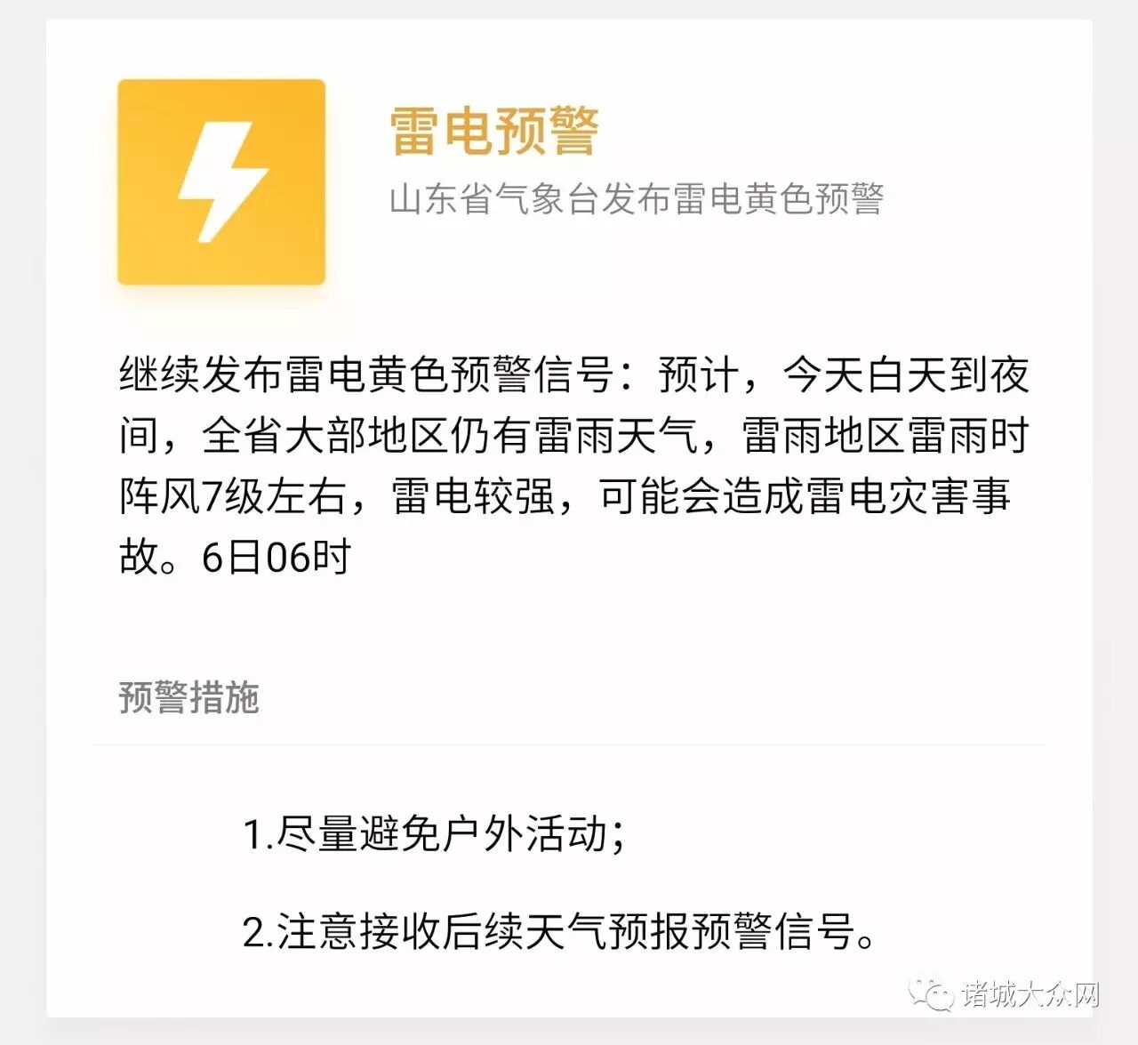 山东省气象台于5日8时继续发布雷电黄色预警信号,目前,山东省滨州、东营和潍坊地区雷雨天气仍在持续,预计今天白天到夜间,鲁西北、鲁中地区仍有离散型雷暴天气并伴有短时强降水,雷雨地区雷雨时阵风7级左右,雷电较强,可能会造成雷电灾害事故。
